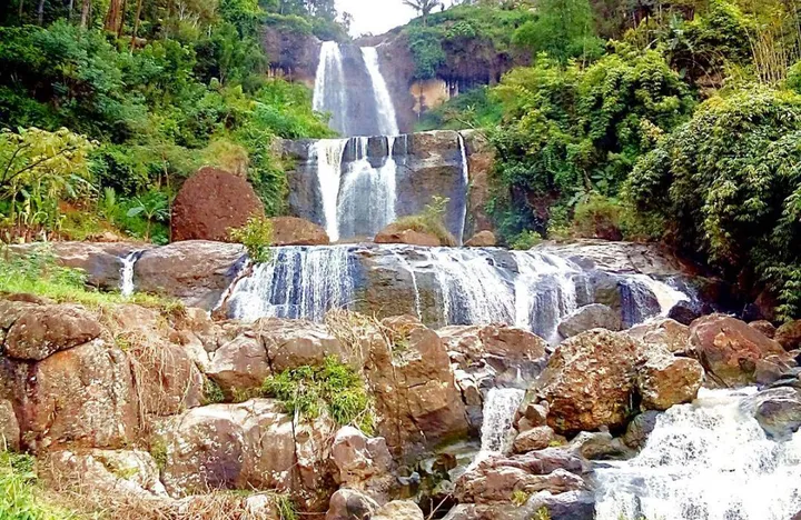 Air terjun bertingkat dengan panorama hijau alami dan udara yang sejuk.