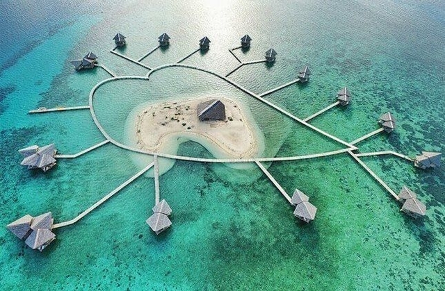 Dikenal sebagai “Maldives-nya Indonesia”, resort berbentuk hati ini menawarkan privasi total di tengah laut jernih.