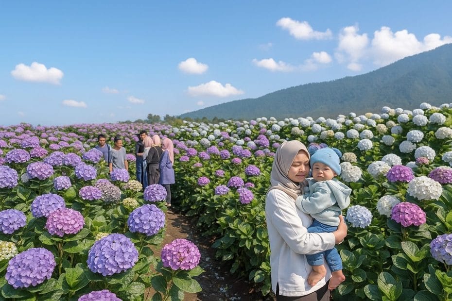 Taman bunga ini menyajikan hamparan bunga hortensia berwarna-warni dengan latar pegunungan yang indah. Spot ini sangat cocok untuk fotografi dan wisata keluarga.