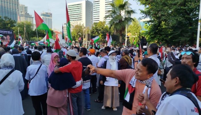 Selain doa bersama, massa juga menyuarakan dukungan terhadap kemerdekaan Palestina. Bendera Palestina tampak berkibar di tengah kerumunan, diiringi lantunan lagu-lagu perjuangan yang dinyanyikan bersama.