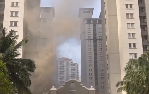 Dari rekaman video yang beredar di media sosial, terlihat kepulan asap hitam pekat membumbung tinggi dari gedung apartemen. Petugas berjibaku menyemprotkan air dari berbagai sisi untuk menjinakkan kobaran api.