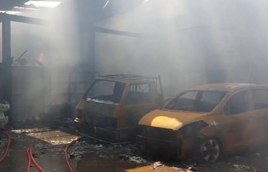 Selain bangunan gudang, sejumlah kendaraan yang terparkir di dalam area juga ikut hangus terbakar.