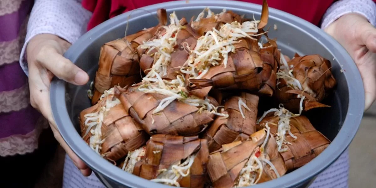 - Ketupat dibelah simetris, diisi tauge, kelapa parut, dan sambal merah dengan aroma kencur kuat.