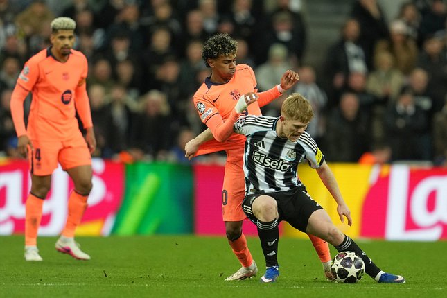 Bek muda Newcastle Lewis Hall menghadapi ujian berat saat menjaga wonderkid Barcelona, Lamine Yamal.