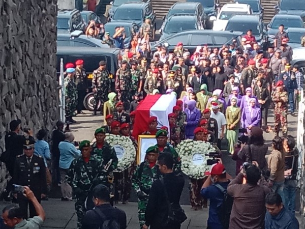 Upacara berlangsung khidmat dengan penghormatan penuh militer. Peti jenazah yang dibalut bendera Merah Putih tiba di lokasi sekitar pukul 08.30 WIB dan dibopong oleh prajurit TNI.