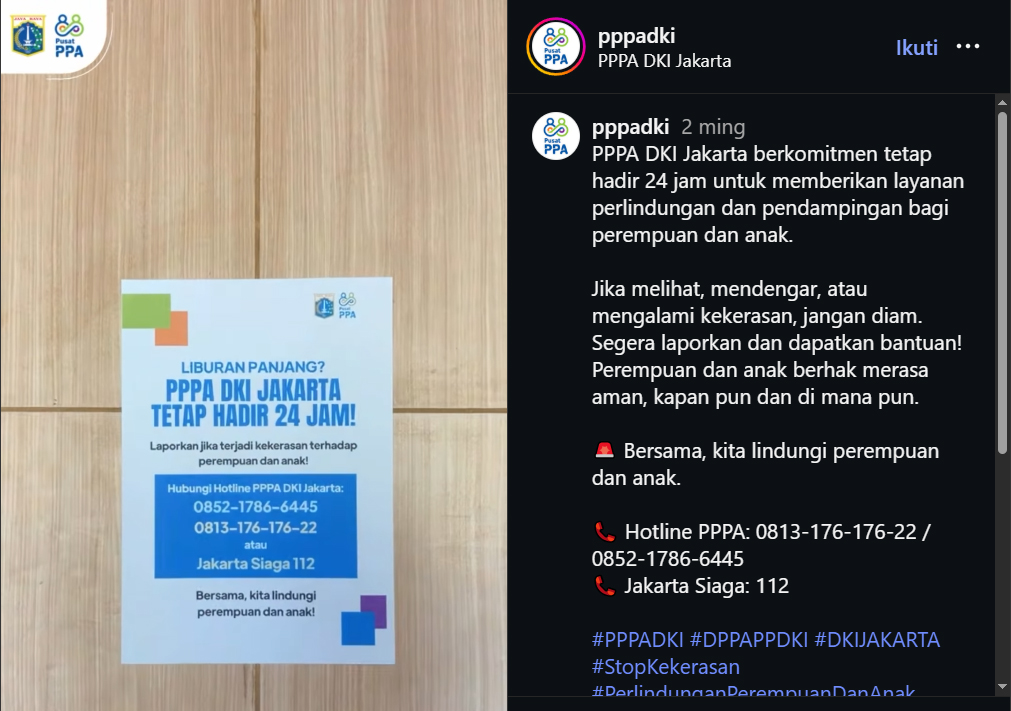 Kepala Dinas PPAPP DKI Jakarta, Dwi Oktavia, menegaskan bahwa masyarakat tidak perlu ragu untuk melaporkan setiap dugaan kekerasan melalui layanan resmi yang telah disediakan pemerintah.