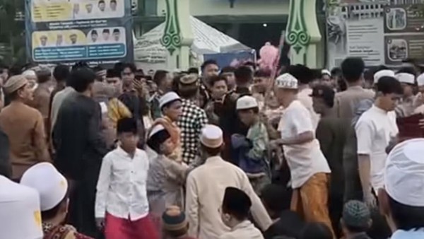 Dalam video yang beredar, tampak sejumlah jemaah terlibat aksi saling pukul di area luar masjid yang digunakan sebagai saf tambahan. Keributan itu sempat mengundang perhatian jemaah lain yang berupaya melerai.