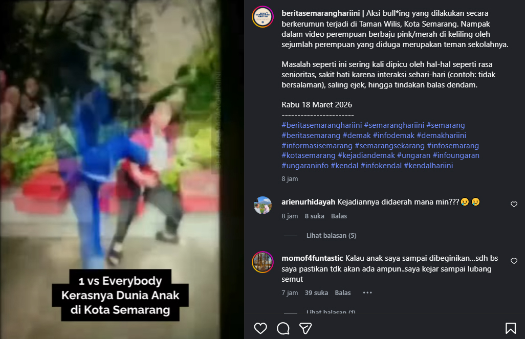 Peristiwa itu pertama kali mencuat melalui unggahan akun Instagram @beritasemaranghariini pada Rabu (18/3/2026). Dalam video yang beredar, terlihat seorang remaja perempuan diduga menjadi korban kekerasan oleh sekelompok remaja lainnya.